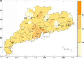 本周(8月26日—9月1日),全省平均气温28.7℃,较常年同期(28.1℃)偏高0.6℃(图1)。全省平均日照时数46.5小时,比常年同期(42.6小时)略偏多9%。全省平均降水量30.9毫米,比常年同期(53.4毫米)偏少42%,降水分布(图2):粤东和粤西局部40毫米以上,其中潮汕地区和湛江局部80~120.8毫米,其余大部分地区40毫米以下。