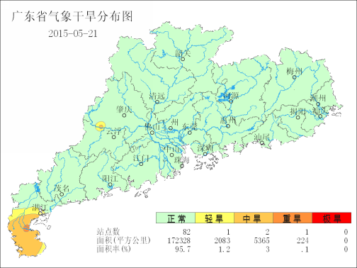 目前我省雷州半岛局部气象干旱仍在持续外,其余大部地区气象干旱解除,据气象干旱监测显示,目前我省仍有1个站轻旱,2个站中旱,1个站重旱(图2)。