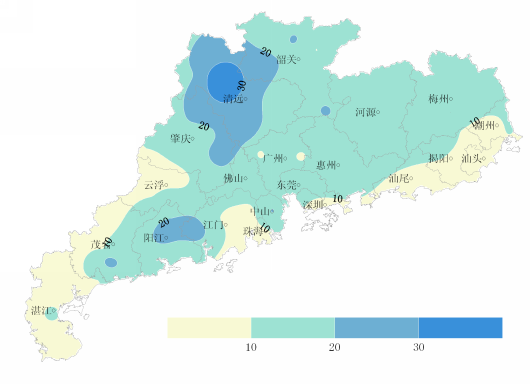 降水情况:全省平均旬降水量13.5毫米,较常年同期偏少近6成。旬雨量分布不均:西北局部20.0~30.0毫米(阳山39.4毫米),东南沿海和西南局部2.9~10.0毫米,其余大部分地区10.0~20.0毫米(图1)。与常年同期相比,仅茂名、徐闻偏多2成,东北偏北和东南沿海偏少7~9成,其余大部分地区偏少2~7成。