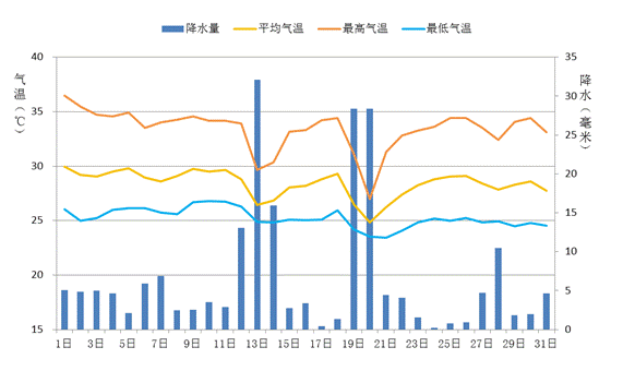 8月全省平均气温28.4℃,较常年同期偏高0.1℃。各地平均气温介于25.9℃(连山)~30.3℃(顺德),粤北局地、珠江口、粤东沿海及梅州、徐闻等地气温在28.5℃以上,连山、怀集、信宜一线气温低于28.0℃,其余大部分地区气温在28.0~28.5℃之间。与常年同期相比,珠江口南部市县、粤东沿海以及梅州、徐闻等地偏高0.3~1.2℃,连山、怀集、信宜一线气温偏低0.3~1.1℃,全省其余地区气温正常。