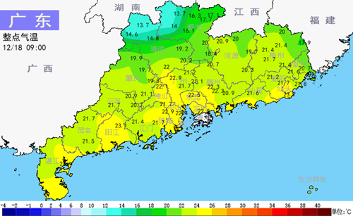21日,西北部阴天有小雨,其余市县多云间阴天有零星小雨。最低气温:粤北5~9℃(高海拔山区4-5℃左右),南部沿海市县14~17℃,其余市县9~14℃。