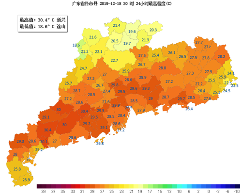 受冷空气影响,18日白天粤北多云转阴天,局部有小雨,清远三连和阳山、韶关乐昌和乳源气温明显下降,中南部气温高企,其中云浮新兴录得全省最高气温30.4℃。19日继续受冷空气影响,我省大部气温较昨天明显下降,天气阴冷。
