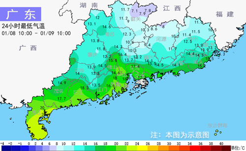 8日我省多云为主,9日早晨全省最低气温分布:河源和梅州的北部市县、韶关市县、龙门、紫金、从化和佛冈8~11℃,珠三角南部和粤西市县17~20℃,其余市县12~15℃。另外,8日白天到9日早晨,我省海面出现了6~7级阵风8级的东北风。