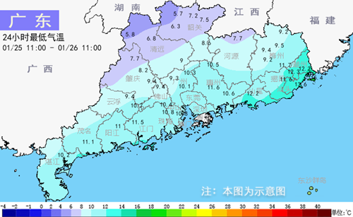26日(初二)白天,珠江三角洲、河源、梅州、韶关、清远南部有中雨局部大雨,其余市县小雨局部中雨,天气湿冷;初三初四分散小雨转阴天到多云,天气仍然寒冷。初五初六转干(晴)冷天气。粤北和珠江三角洲的北部市县5℃以下的低温,粤北高海拔(600米以上)山区0℃左右有冰冻。