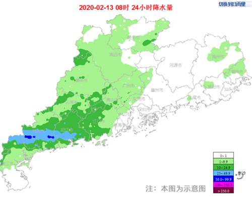 2月12日到13日早晨,湛江、茂名、阳江出现了中到大雨局部暴雨,肇庆、云浮、江门、佛山、广州、清远、韶关出现了小到中雨,其余市县出现了分散阵雨,部分地区出现了回南天气。12日08时到13日08时,茂名高州市根子镇录得最大小时雨量49.5毫米,茂名电白区罗坑镇录得最大累积雨量69.1毫米。此外,13日早晨,湛江、茂名、阳江出现了8~9级雷雨大风;湛江、茂名、江门、珠海局地出现了冰雹;我省大部轻雾或雾明显,其中,珠三角大部、粤东、粤北偏北市县出现能见度小于500米的大雾。